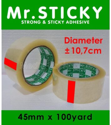 Spesifikasi ProdukDetailMerkMR.STICKYLebar45mm (2 Inch)Panjang per Rol100 Yard (setara dengan 90 meter)Tebal45...