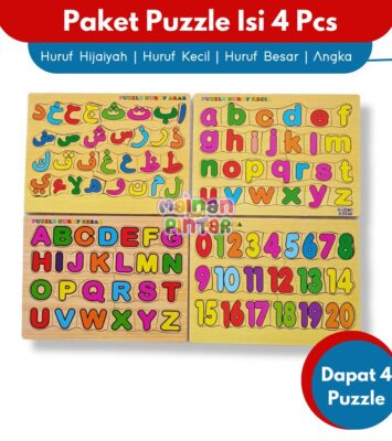 Mainan Edukasi Anak Paket Puzzle Kayu Isi 4 Pcs: Huruf Hijaiyah, Huruf Besar, Huruf Kecil, dan Angka 0-20