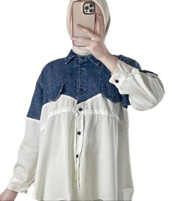 Cuppita Kemeja Jeans Mix Rayon Pinggang Serut Premium Full Kancing Katun Kerja Atasan Wanita Panjang Oversize Casual Basic Tangan Variasi Linen Formal