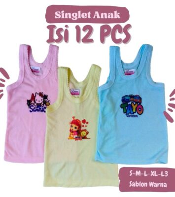 12 Pcs (1 Lusin) Singlet Anak Cewe/Cowo Karakter – Bahan PE Double Premium, Ukuran S-3XL