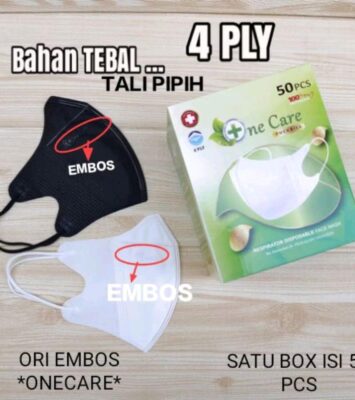 Fitur UtamaDeskripsiKemasanBox isi 50 pcsJenisMasker Duckbill 4ply dengan embos “OneCare”Material4 lapis...
