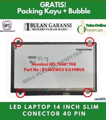 Spesifikasi TeknisDetailKompatibilitas PanelB140XW03 V.0Tipe PanelLCD ScreenUkuran Layar14.0″...