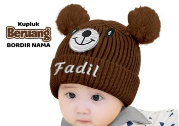 Topi Bordir Nama Kupluk Pompom Karakter Beruang untuk Bayi
